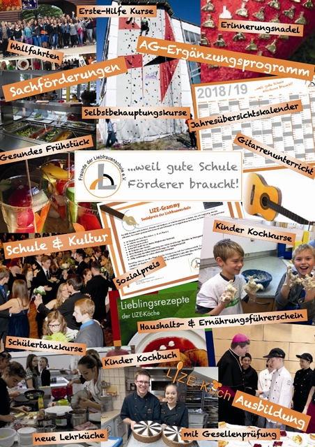 Die Kinder, Eltern oder Lehrer fragen an, der Verein lässt sich etwas einfallen und fördert wo immer möglich - finanziell, ideell und mit konkreten Angeboten. So sind viele Projekte entstanden, die schon bald zur Tradition oder sogar zum Schulprofil gehören sollten, wie der LIZE-Grammy (PDF) (Sozialpreis der Schule), Schülertanzkurse mit festlichem Abschlussball, regelmäßige Zuschüsse zu klassenübergreifenden Aus- und Wallfahrten sowie kleine und große Sachförderungen wie z.B. das Salatbuffet in der Schulmensa, die Kletterwand im Sportbereich, eine weihnachtliche Lichtinstallation im Atrium und der Bau einer neuen modernen Schulküche, um nur eine Auswahl zu nennen.