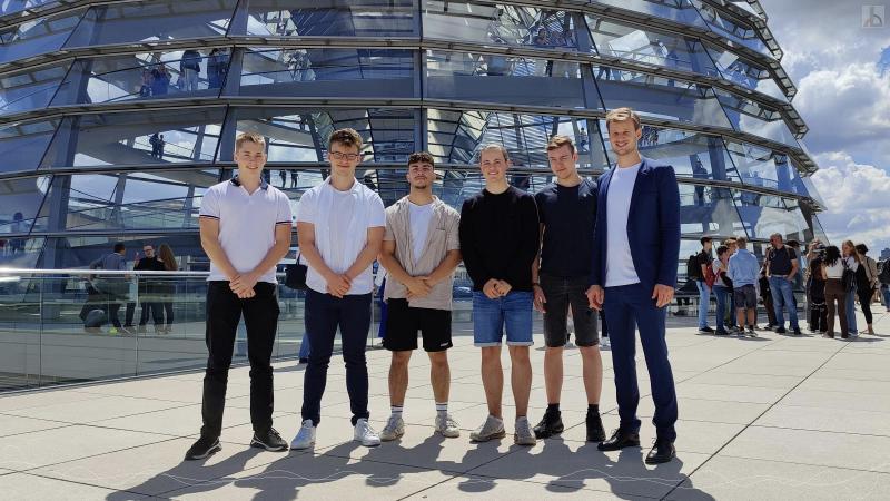 Fünf Schüler der aktuellen Abiturstufe nutzten die schulfreien Tage nach den mündlichen Prüfungen, um sich auf eine politische Bildungsfahrt zu begeben. Organisiert wurde die Fahrt von unserem ehemaligen Schüler, Robin Mesarosch, welcher inzwischen als Abgeordneter im Bundestag sitzt. Das Programm umfasste u.a. eine Besichtigung des Reichstagsgebäudes, eine Diskussionsrunde mit Robin Mesarosch und eine Stadtrundfahrt.