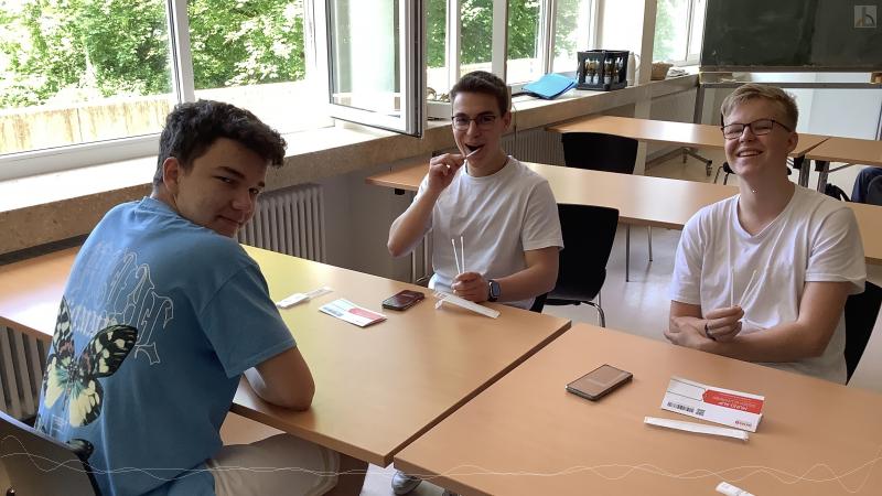 Im Foto oben sind die fleißigen Helfer aus der J2 zu sehen, unten SchülerInnen der J1 bei der Probeentnahme. Hierbei werden mit Wattestäbchen Zellen der Mundschleimhaut entnommen.