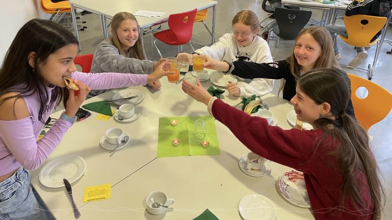 Unsere sechsten Klassen dürfen in dieser Woche einmal an der Schule frühstücken. Im Externatsspeiseraum warten schön gedeckte Tische und ein leckeres Buffet auf sie. Alle Lebensmittel sind dabei fair gehandelt und stammen aus dem Sigmaringer Weltladen oder sind frisch aus der Region. Den SchülerInnen soll dabei nahegebracht werden, dass beim Einkauf von Waren aller Art auch immer die Bedingungen der Menschen, die mit deren Herstellung zu tun haben, ein wichtiger Aspekt sein sollte.