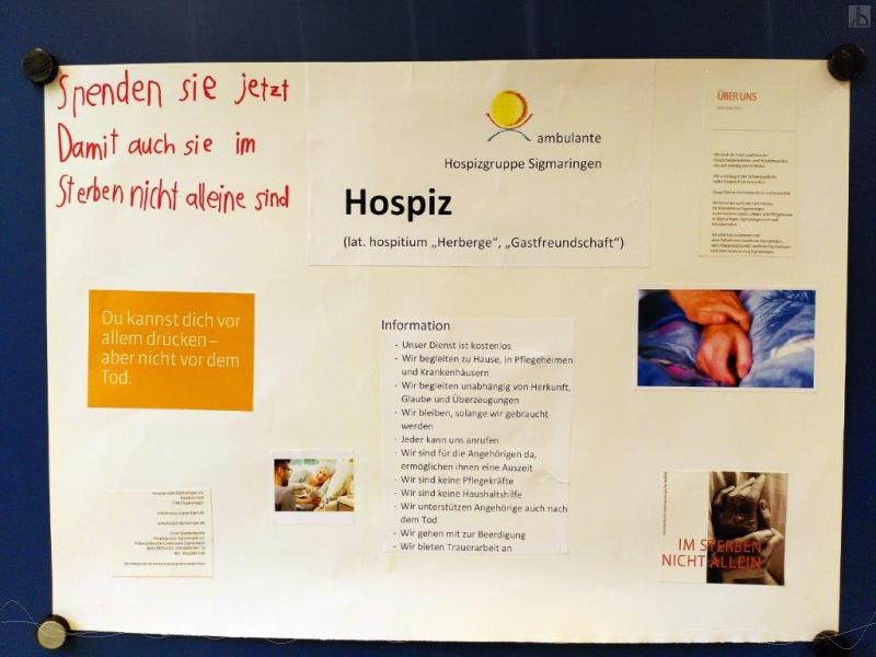 Der zweiten Klassengruppe wurde die Ambulante Hospizgruppe in Sigmaringen von zwei erfahrenen Mitarbeiterinnen vorgestellt. Vielen SchülerInnen war die Bedeutung dieser Arbeit für die schwerkranken Menschen vorher nicht bewusst. Sie waren sehr interessiert und erkannten schnell wie wichtig die Aufgaben bei der Begleitung von Sterbenden sind.